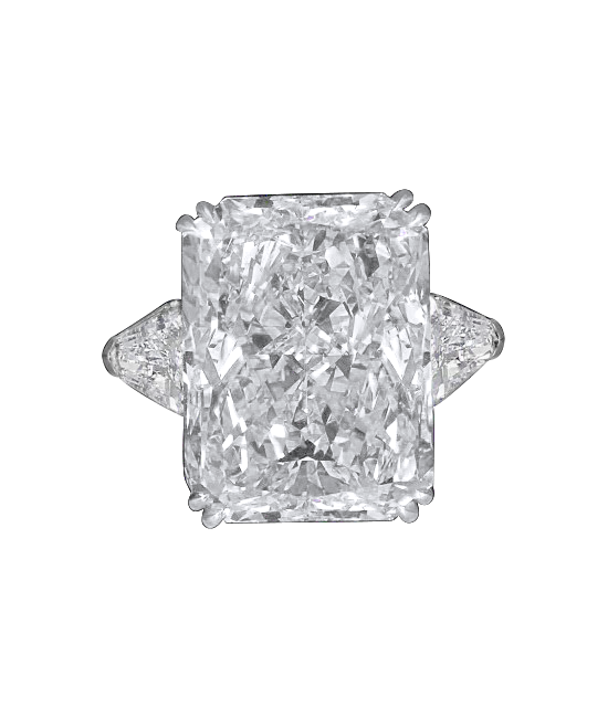 18K white gold ring set with a 10.31 carat white radiant cut diamond surrounded by two 4.86 carat kite shaped diamonds.
